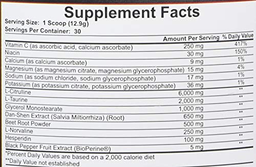 L-citrulline (46,5 %),L-taurine (15,5 %), glycerol monostearate (7,75 %), Dan-Shen root extract (Salvia Miltiorrhiza) (5%), beetroot powder (3,9 %),L-norvaline (1,9 %), Vitamin C (ascorbic acid, calcium ascorbate) (1,9 %) , hesperidin, Salt (sodium chloride), Potassium (potassium citrate, potassium glycerophosphat), Niacin (nicotinamide), Magnesium (magnesium citrate, magnesium glycerophosphate), Calcium (calcium ascorbate), BioPerine (black pepper fruit extract), acid: citric acid, natural flavouring, anti-caking agent: silicon dioxide, sweetener: sucralose, sweetener: acesulfame K, colour: FD&C Blue #1 (Brilliant Blue FCF – E133)