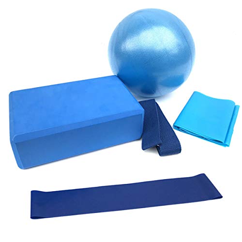 5 Piece Yoga Sets Beginner Equipment Include Fitness Mini Yoga Ball (10 inch) Yoga Blocks Stretch Strap Resistance Loop Bands Exercise Yoga Cotton Strap