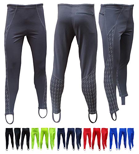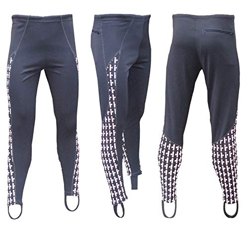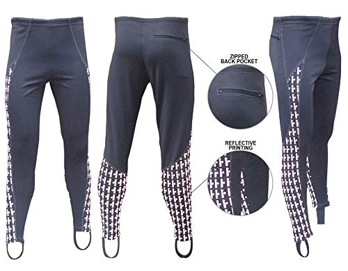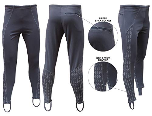 Tie cord elasticated waist classic style leggings with stirrups. Simple trackster style easy pull on, comfortable to wear and easy to move in for sport and leisure. Multifunctional design cycling running training, four way stretch lightweight showerproofed polyester with a rear zipped back pocket. Modern panel cut design for comfort and flexibility with reflective Acclaim print side panels. Classic relaxed fit not too tight fitting plus the stirrups hold the legs in position when worn, manufactured from machine washable polyester. Available in Sizes S-XXXL and six classic colours easy to wear and pack in your sports bag or luggage to exercise anywhere. Large reflective print area to enhance your visibility.