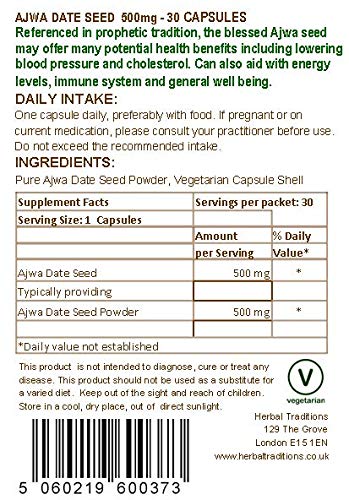 Ajwa Date Seed Powder Capsules natural support for healthy heart maintenance 30 x Vegetarian Capsules Referenced in prophetic tradition, the blessed ajwa seed may offer many potential health benefits including lowering blood pressure and cholesterol. Can also aid, with energy levels, immune system and general well being. . Potential Benefits: Blood Pressure Blood Sugar Control Lower Cholesterol Increased Energy Prevention of Stroke Pure Ajwa Date Seed Powder Capsules – 100% Vegetarian