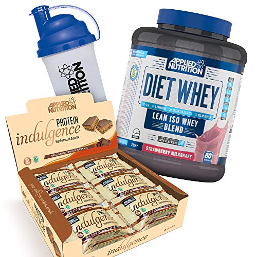 Applied Nutrition Bundle Diet Whey Protein Powder Low Carb & Sugar 2kg + Protein Indulgence High Protein Low Sugar Bar Box 12 x 50g + 700ml Shaker (Diet Whey Straw + Choc Caramel Bars)