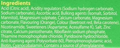 Citric acid, Sodium hydrogen carbonate, Vitamin C, Magnesium sulphate, Mannitol, Calcium carbonate, Magnesium carbonate, Favouring, Sodium carbonate, Niacin, Sweeteners (Acesulfame K, Aspartame), Sodium chloride, Zinc citrate, Colour (Beetroot red, Beta carotene), Pantothenic acid, Maltodextrin, Riboflavin, Thiamin, Acacia gum, Vitamin B6, Partially hydrogenated soybean oil, Sugar, Trisodium citrate, Anti-foaming agent (Polysorbate 60), Folacin (Folic acid), Antioxidants (DL – alpha tocopherol, Sodium ascorbate), Biotin, Citric acid, Vitamin B12
