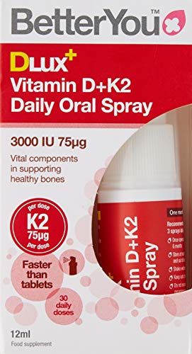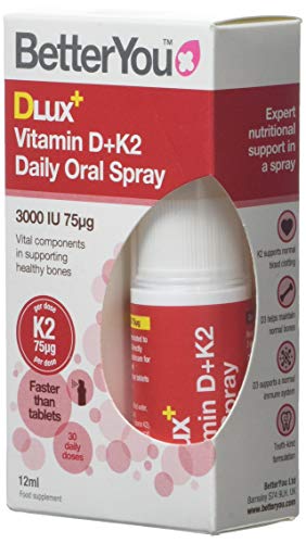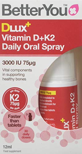 BetterYou DLux+ Vitamin D+K2 Oral Spray is an optimum strength spray delivering 3000iu of vitamin D alongside 75μg of vitamin K2. The pinoerring delivery method allows the vital vitamins to be absorbed directly into the bloodstream, bypassing the digestive system where many nutrients are lost. A spray provides the active ingredient in micro-sized droplets. The plume of the spray is designed to coat the inside of the mouth, in particular the buccal membrane of the inner cheek which research shows it the most effective area of absorption.