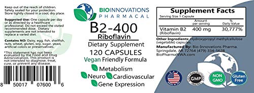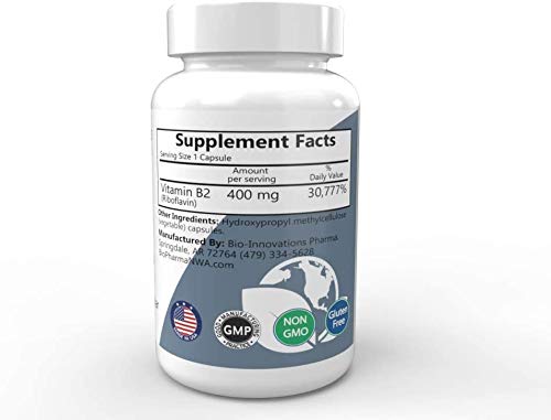 Vitamin B2 (Riboflavin) is a nutrient that is essential for energy production and the metabolism of carbohydrates, fats, and proteins. Riboflavin is found in small quantities (less than 1 mg) in a variety of foods, but some people may benefit from much higher doses. B2-400 is a unique formula that provides 400 mg of pure riboflavin per capsule. Research suggests that 400 mg of riboflavin per day may help certain individuals maintain mental clarity, healthy mood, and optimal productivity. NICE Guidance CG150 states: Advise people with migraine that riboflavin (400 mg once a day) may be effective in reducing migraine frequency and intensity for some people. This product is manufactured in USA by Bio-Innovations Pharmacal, LLC. under Good Manufacturing Practice ( GMP ), which ensures high quality, and is supplied with original packaging and labelling.