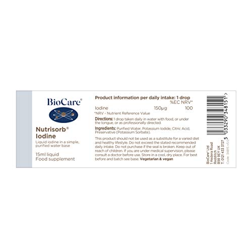 BioCare nutrisorb liquid iodine drops as bioavailable potassium iodide in a simple, hypoallergenic purified water base. Nutrisorb liquids are a range of high potency liquid nutrients. Iodine contributes to the normal production of thyroid hormones and normal thyroid function, contributes to normal functioning of the nervous system and contributes to normal cognitive function. It contains 150mcg high quality iodine drops.