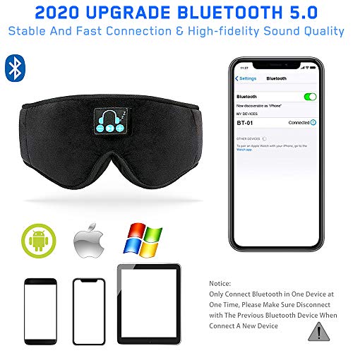 ♬【Upgraded 3D Eye Mask Design】Based on ergonomics, our bluetooth sleep eye mask is perfect for your face. The contours of the eyes area are deeper and your eyes can move freely. No any pressure to your eyes, the new 3D eye mask for sleeping perfectly solves the tightness of the silk eye mask, bring you a comfortable and long-lasting sleep.