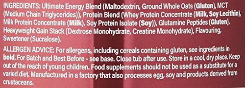 Ultimate Energy Blend (Maltodextrin, Ground Whole OATS (GLUTEN), MCT (Medium Chain Triglycerides), Protein Blend (Whey Protein Concentrate (MILK, SOY Lecithin), MILK Protein Concentrate (MILK), SOY Protein Isolate (SOY), Glutamine Peptides (GLUTEN), Heavyweight Gain Stack (Dextrose Monohydrate, Creatine Monohydrate), Sweetener (Sucralose).