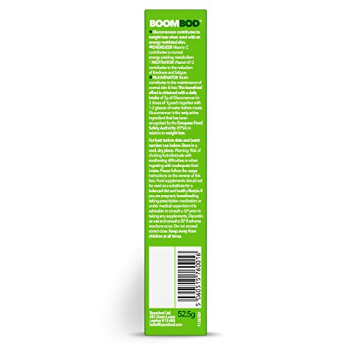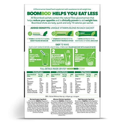 Boombod sachets contain a quality source of the natural fibre glucomannan that reduces appetite. For an extra boost, all three sachets each contain their own unique vitamin blend. The Morning Energizer contains Vitamin C which contributes to normal energy-yielding metabolism. The Afternoon Motivator delivers Vitamin B12 which contributes to the reduction of tiredness and fatigue. The Night Rejuvenator contains Biotin contributes to the maintenance of normal skin & hair.