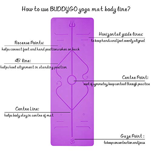 【New Design of BUDDYGO Yoga Mat】Ecological, practical and innovative design, the BUDDYGO Yoga Mat has been designed with an alignment line system which is an invaluable guide when trying to improve yoga mat posture, yoga mat balance and yoga mat stretching exercises.