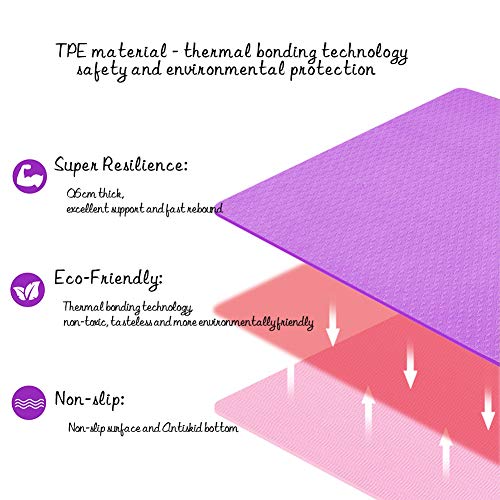 【Perfect Performance】Double layer structure design provides optimal grip, excellent cushioning. Non slip on smooth floor. 0.6CM thick professional yoga mat with high-density, great supporting and quick spring-back make it suitable for various yoga movements. It offers the most comfortable experience of excellent cushioning for all level Yogis.