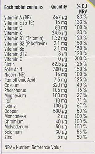 Calcium salts of orthophosphoric acid (Dicalcium phosphate); Calcium carbonate; Magnesium oxide; Bulking agents: E 460, E 464, E 1200; L-ascorbic acid; Anticaking agents: E 468, E 551, E 553b; Ferrous fumarate; DL-alpha tocopheryl acetate; Nicotinamide; Calcium D-pantothenate; Manganese sulphate; Zinc oxide; Emulsifier: E 470b; Pyridoxine hydrochloride; Riboflavin; Gelatine; Thiamin mononitrate; Beta-carotene; Vegetable oil (Coconut & Palm kernel); Cupric sulphate; Retinyl acetate; Pteroylmonoglutamic acid; Chromium (III) chloride; Sodium molybdate; Potassium iodide; Sodium selenate; D-biotin; Antioxidant: E 321; Phylloquinone; Cholecalciferol; Cyanocobalamin; Colours: E 171, E 120, E 133.