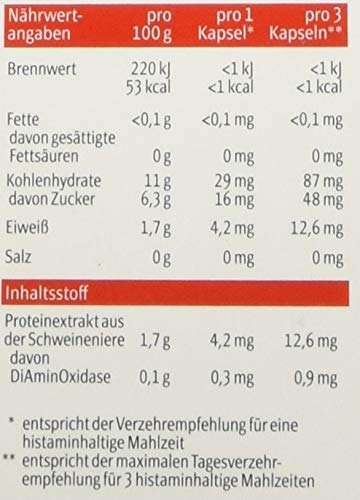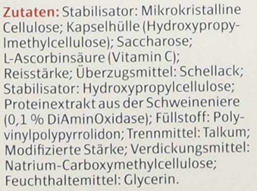 Stabilizer: Microcrystalline cellulose; Hydroxypropyl methyl cellulose; Stabilizer: Sucrose; L-Ascorbic acid; Stabilizer: rice starch, glazing agent: shellac; Stabilizer: Hydroxypropylmethylcellulose; Protein extract * with natural DAO proportion (7%); Thickener: Polyvinylpolypyrrolidone; Agent: TALC; Thickener: modified rice starch, carboxymethyl cellulose; Humectant: Glycerol. * from pig kidney (biological origin)