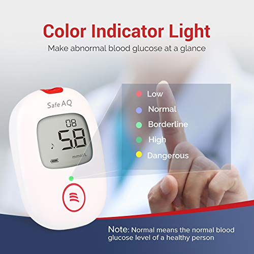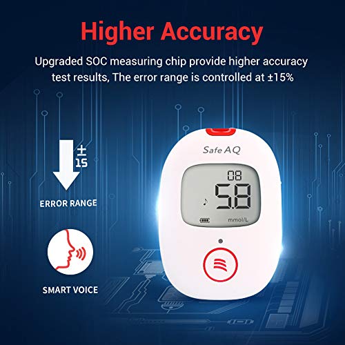 Sinocarecommitted to innovation in biosensor technology to provide high quality products and services for people with diabetes, help them improve their life quality with fast diagnosis. Safe-aq voiceblood glucose monitor smart than ever with voice indicator! Voice prompt for every test steps as well as results, to get accurate blood glucose testing in just 5 seconds, more easily and conveniently use for the elderly.The upgraded processor and algorithm controls the error value between 15%; higher anti-interference ability means more accurate diabetes results. Friendly design give you peace of mind you only need to insert The test strip to complete the test, no coding or any other complicated processes. Light Warning For blood glucose levels and you can easily understand the measured value by comparing the light colour to the self-checking card. Convenient strip ejection system to remove test strips once test is done, great for hygiene. The small, elegant design makes it ultra-portable, easy to switch between home use and go out. Specification blood sample: fresh capillary whole blood, venous whole bloodcalibration sample: venous plasmatest range: 1.1-33.3mmol/lfast test time: 5Stiny blood volume: 0.6ul sample sizehct: 30-60%expiry date: 24 monthsmemory: 10 test results battery life: up to 1000 tests (battery is not included in the package)battery type: 2 AAA alkaline batteries 3Vdc.