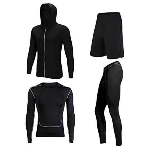 Dooxi Mens 4pcs Sports Fitness Gym Clothing Set Hoodies Jackets+Base Layers T Shirts+Loose Fitting Shorts+Compression Pants for Workout Training Running Tracksuits