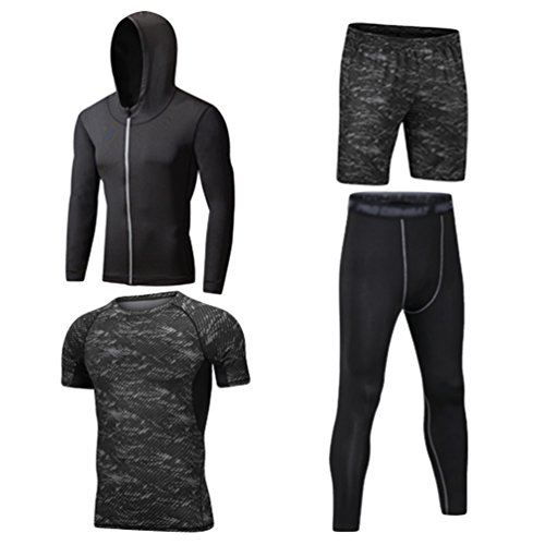Dooxi Mens 4pcs Sports Gym Fitness Clothing Set Hoodies Jackets+Base Layers T Shirts+Loose Fitting Shorts+Compression Pants for Workout Training Running Tracksuits