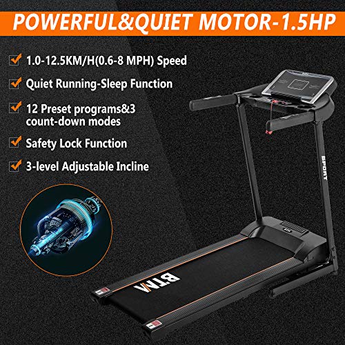 【Higher speed and 3-level adjustable manuel incline】With a smooth and quiet 1.5HP treadmill motor, it supports speeds ranging from 1.0 – 12.5 KM/H (0.6 – 8.0 MPH). What’s more, this treadmill has 3-level manual adjustable incline, you can choose the suitable incline to increase the intensity of training.