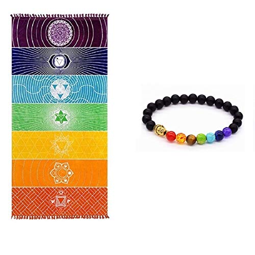EverFabulous Thick Square Bohemia Mandala Yoga Blanket Pure Cotton 7 Chakra Yoga Towel Tassels Rainbow Tapestry Stripes Beach Towel Yoga Mat with Lucky Beads 59×29.5 inch