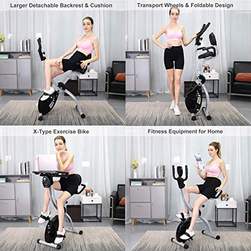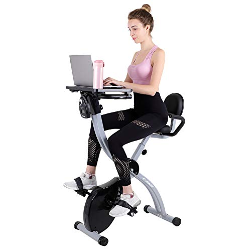 Exercise Bike, Folding Fitness Bike with Desktop Sporting Equipment Cardio Trainer 8 Level Magnetic Resistance Transport Wheels and Backrest Adjustable Seat LED Monitor Heart Rate