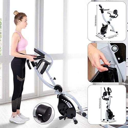 Exercise Bike Folding Design – Exercise bike and Twist Plate can be folded, Product size : 29.13″ x 16.54″ x 43.7″. Folding size : 16.5″ x 10.24″ x 55.12″. Save a lot of space. Can be moved with the transportation wheels. Wide & Comfortable seat with backrest and padded seat handle holds up to 265 lbs. The seat can also be adjusted to more closely approximate your situation.