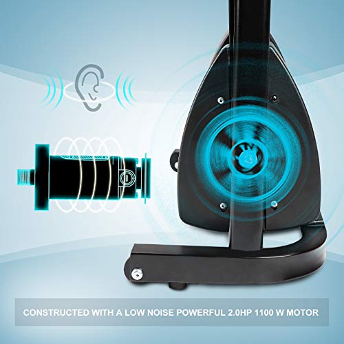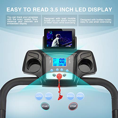 Designed with Ipad/mobile holder and bottles holder,easy to use when exercising,Constructed with a low noise powerful 2.0HP 1100 W motor Textured non-slip tread belt and a sturdy metal frame, With an easy to read 3.5 inch LED display ,Speed, Time, Calories, Distance, Heart Rate are embedded display so you can track your progress