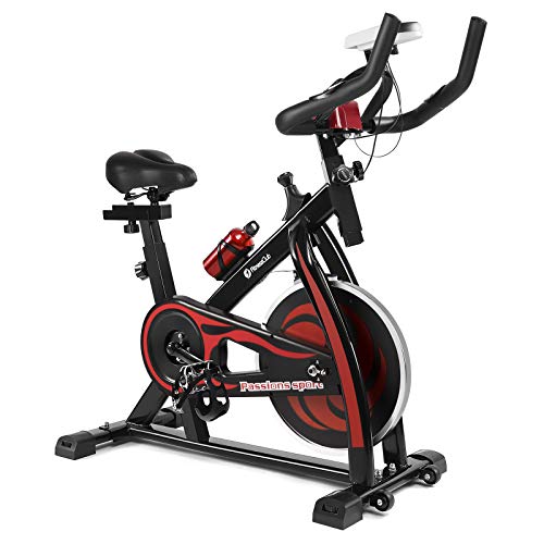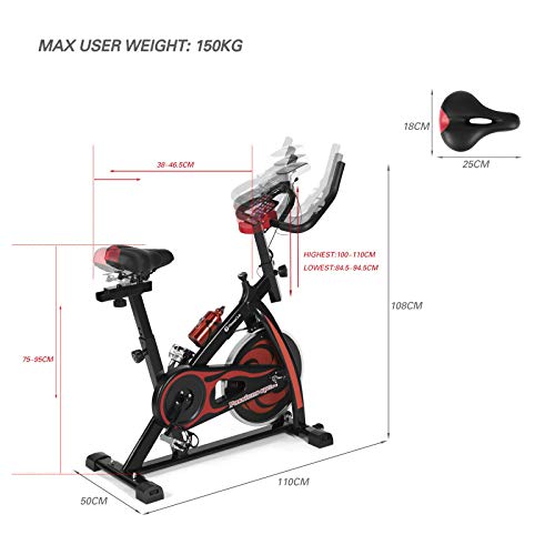 Fitnessclub Indoor Exercise Bike Cardio Workout W/Belt Driven Flywheel Cycling Adjustable Handlebars Seat Resistance Digital Monitor Heart Rate Sensors W/Phone Holder Bottle Red