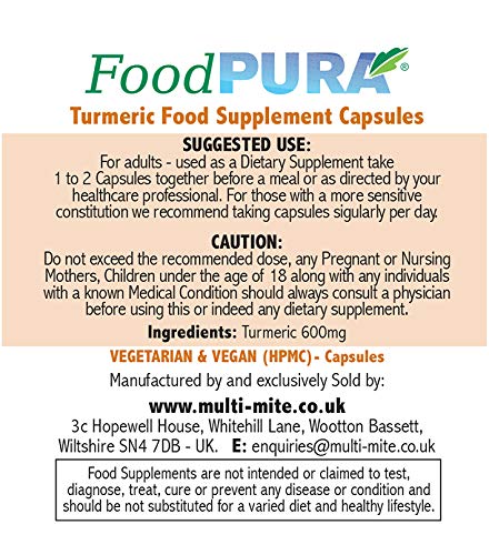 TURMERIC (Curcumin) 600mg CAPSULES Suitable for Vegetarians & Vegans (HPMC) NO ADDED FILLERS & NON GMO ingredients See Our other Quanities Listings and with Black Pepper, BioPerine and others! The active ingredient in Turmeric is Curcumin. All our products are Manufactured & Packaged in the UK to Standards required by UK Legislation and the Food Standards Agency, all packaging is Food Safe and Heat Sealed prior to delivery – All bags are Re-Sealable. Supports the maintenance of healthy joints Supports a healthy digestive tract. Supports a healthy circulatory system Reduces Inflammation Healthy Skin and Healthy Hair General Well Being Antioxidant Properties Supports healthy cholesterol balance Supports healthy liver & Lungs Detoxification Liver Each Capsule contains: 600mg of Turmeric FAST dispatch: All Orders Despatched Sameday (Mon-Fri) on all orders received by Midday! DOSEAGE: See reverse label. Nothing Added: NO Fillers or anything else. PURE High Strength Turmeric. Store cool and dry away from light, heat and children. BUY IN CONFIDENCE FROM AN WELL ESTABLISHED REGISTERED UK HEALTH CARE BUSINESS