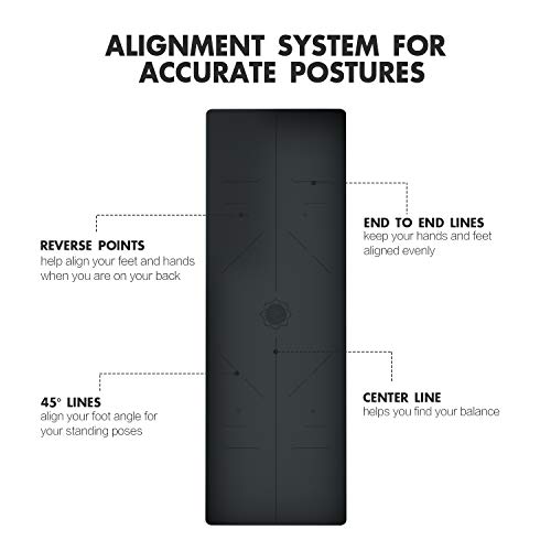 Body Alignment System: has alignment marks to make sure that your hands and feet are in alignment with each other when doing yoga poses.