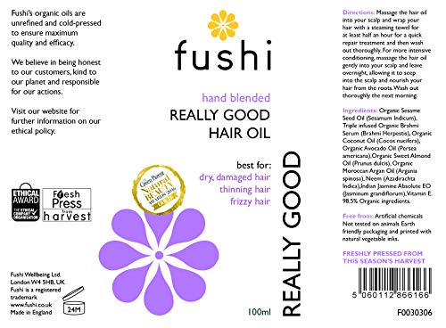 Fushi Really Good Hair Oil 100 ml | Rich in Antioxidants | Best for Dry & Damage Hair, Thinning Hair, Frizzy Hair | Ethical & Vegan Society Approved | Manufactured in the UK