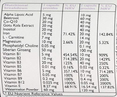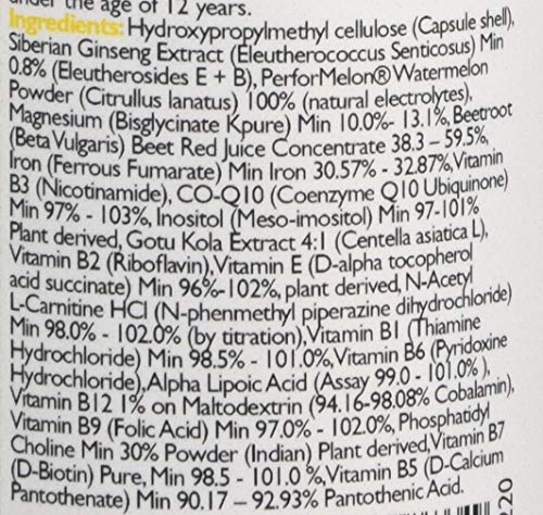 Hydroxypropylmethyl cellulose (Capsule shell), Siberian Ginseng Extract (Eleutherococcus Senticosus) Min 0.8% (Eleutherosides E + B), PerforMelon Watermelon Powder (Citrullus lanatus) 100% (natural electrolytes), Magnesium (Bisglycinate Kpure) Min 10.0%- 13.1%, Beetroot (Beta Vulgaris) Beet Red Juice Concentrate 38.3 – 59.5%, Iron (Ferrous Fumarate) Min Iron 30.57% – 32.87%, Vitamin B3 (Nicotinamide), CO-Q10 (Coenzyme Q10 Ubiquinone) Min 97% – 103%, Inositol (Meso-imositol) Min 97-101% Plant derived, Gotu Kola Extract 4:1 (Centella asiatica L), Vitamin B2 (Riboflavin), Vitamin E (D-alpha tocopherol acid succinate) Min 96%-102%, plant derived, N-Acetyl L-Carnitine HCl (N-phenmethyl piperazine dihydrochloride) Min 98.0% – 102.0% (by titration), Vitamin B1 (Thiamine Hydrochloride) Min 98.5% – 101.0%, Vitamin B6 (Pyridoxine Hydrochloride), Alpha Lipoic Acid (Assay 99.0 – 101.0% ), Vitamin B12 1% on Maltodextrin (94.16-98.08% Cobalamin), Vitamin B9 (Folic Acid) Min 97.0% – 102.0%, Phosphatidyl Choline Min 30% Powder (Indian) Plant derived, Vitamin B7 (D-Biotin) Pure, Min 98.5 – 101.0 %, Vitamin B5 (D-Calcium Pantothenate) Min 90.17 – 92.93% Pantothenic Acid. Free from: Fillers, Binders, Gluten, Wheat, Lactose, Preservatives, Artificial Colouring, Yeast, Sugar, Animal testing