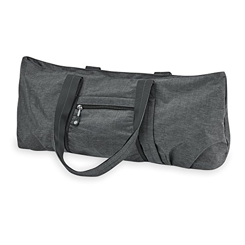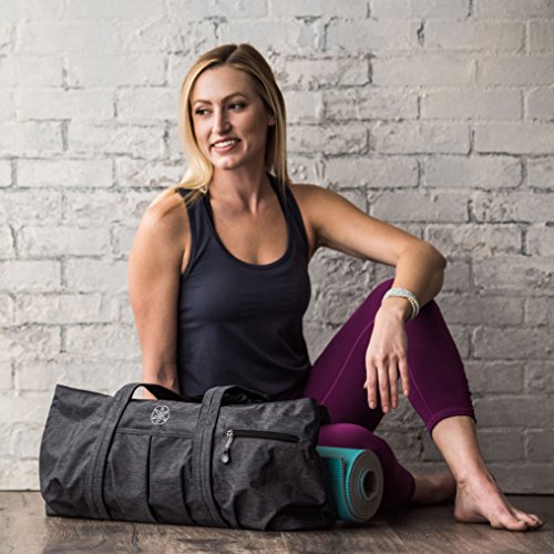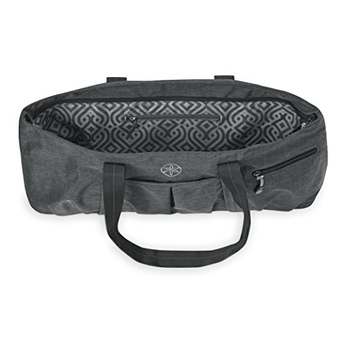 The Gaiam All Day Yoga Tote features a large main compartment that fits all your gear as well as a side pocket that secures mat making for easy transport while the inner and outer zippered pockets keep your essentials safe. Also features a fashion print easy-clean liner and a comfortable reinforced carry strap