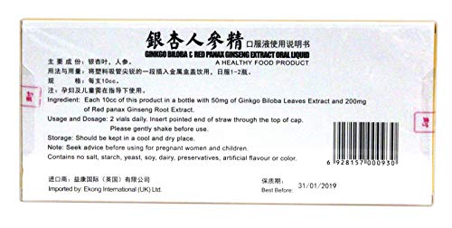 Each 10cc of this product in a bottle with 50mg of Ginkgo Biloba Leaves Extract and 200mg of Red panax Ginseng Root Extract.
