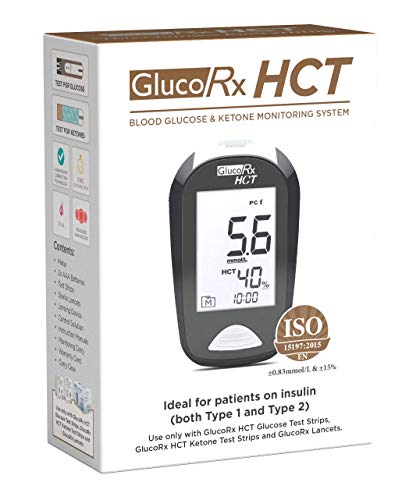 Uses GlucoRx HCT glucose test strips and GlucoRx HCT ketone test strips. Also GlucoRx lancets