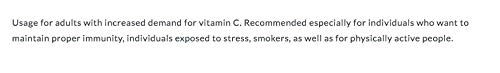 This product should not be used in the case of hypersensitivity to any of its ingredients. If you suffer from urolithiasis (calcium oxalate or urate), iron imbalance (thalassemia, haemochromatosis), or if you are pregnant or breastfeeding, consult a physician before taking this product. Do not consume other preparations containing vitamin C. Excessive intake (exceeding a daily dose) can have a laxative effect. In cases of gastrointestinal tract symptoms, discontinue use.