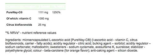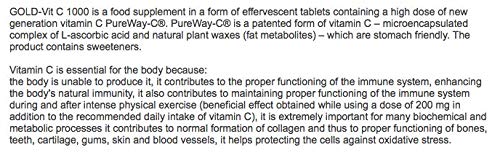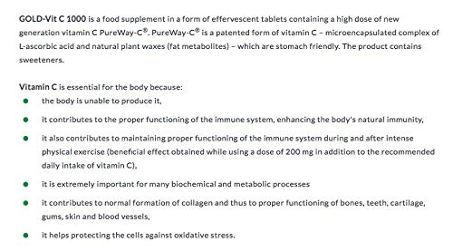GOLD-Vit C 1000 is a food supplement in a form of effervescent tablets containing a high dose of new generation vitamin C PureWay-C®. PureWay-C® is a patented form of vitamin C – microencapsulated complex of L-ascorbic acid and natural plant waxes (fat metabolites) – which are stomach friendly. The product contains sweeteners. Vitamin C is essential for the body because: the body is unable to produce it, it contributes to the proper functioning of the immune system, enhancing the body’s natural immunity, it also contributes to maintaining proper functioning of the immune system during and after intense physical exercise (beneficial effect obtained while using a dose of 200 mg in addition to the recommended daily intake of vitamin C), it is extremely important for many biochemical and metabolic processes it contributes to normal formation of collagen and thus to proper functioning of bones, teeth, cartilage, gums, skin and blood vessels, it helps protecting the cells against oxidative stress.