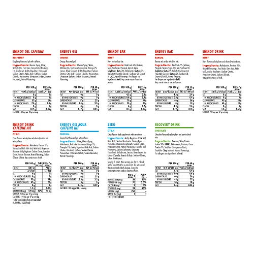 Energy Gel Caffeine Raspberry: Glucose Syrup, Water, Maltodextrin, Fruit Juice Concentrate (Raspberry 1%, Cranberry), Acidity Regulators (Citric Acid, Sodium Citrates, Malic Acid), Caffeine, Sodium Chloride, Preservatives (Potassium Sorbate, Sodium Benzoate), Natural Flavouring. Energy Gel Orange: Glucose Syrup, Water, Maltodextrin, Fruit Juice Concentrate (Orange 2%, Lemon, Blood Orange), Acidity Regulators (Sodium Citrates, Citric Acid), Sodium Chloride, Preservatives (Potassium Sorbate, Sodium Benzoate), Natural Flavouring. Energy Gel Aqua Caffeine Hit Tropical: Water, Glucose Syrup, Maltodextrin, Fruit Juice Concentrate (Mango 1%, Pineapple 1%), Acidity Regulators (Malic Acid, Sodium Citrates, Citric Acid), Caffeine, Sodium Chloride, Preservatives (Potassium Sorbate, Sodium Benzoate), Natural Flavourings. Recovery Drink Chocolate: Dextrose, Whey Protein Isolate 30% (Milk), Maltodextrin, Fructose, Cocoa Powder 9%, Stabiliser (Carrageenan Gum), Emulsifier (Soy Lecithin), Natural Flavourings. Energy Bar Banana: Dried Fruit 49% (Sultanas, Pineapple, Banana, Sugar, Citric Acid, Sunflower Oil, Sulphites), Oats 25%, Maltodextrin, Humectant (Vegetable Glycerol), Oatbran 2%, Sunflower Oil, Coconut Oil (MCT), Natural Flavouring. Energy Bar Berry: Dried Fruits 60% (Sultanas, Sugar, Cranberries, Pineapple, Apricots, Apple, Sulphites), Oats 26%, Maltodextrin, Oatbran 3%, Humectant (Vegetable Glycerol), Sunflower Oil, Coconut Oil (MCT), Natural Flavourings. Energy Drink Berry: Maltodextrin, Fructose 32%, Natural Flavourings, Food Acids (Citric Acid, Malic Acid), Acidity Regulators (Sodium Citrates, Potassium Citrate), Sodium Chloride. ZERO Citrus: Acidity Regulators (Citric Acid, Malic Acid), Sodium Bicarbonate, Firming Agent (Sorbitols), Magnesium Carbonate, Sodium Citrate, Potassium Citrate, Natural Flavouring, L-Ascorbic Acid (Vitamin C), Calcium Carbonate, Sweetener (Sucralose), Maltodextrin, Leucine, Green Leaves Tea Extract (Camellia Sinensis O.Ktze), Sodium Chloride, Colour (Riboflavins). Energy Drink Caffeine Hit Citrus: Maltodextrin, Fructose 33%, Sucrose, Food Acids (Citric Acid, Malic Acid), Magnesium Gluconate, Acidity Regulators (Sodium Citrates, Potassium Citrate), Calcium Gluconate, Natural Flavourings, Sodium Chloride, Caffeine.