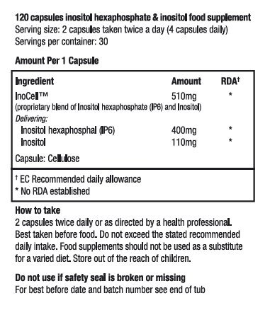 InoCell (Proprietary blend of Inositol hexaphosphate (IP6) and inositol) delivering IP6400mg, inositol 110mg. Capsule: cellulose, Non-active ingredients: magnesium, silicon dioxide. Allergy advise: This product is manufactured in a facility that also handles cereals containing gluten, crustaceans, eggs, fish, peanuts, soybeans, milk, nuts, celery, mustard, sesame seeds, sulphites, lupin and molluscs and products thereof.