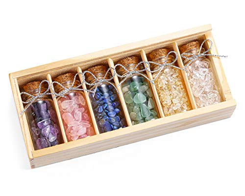 JOVIVI 6 Mini Healing Crystals and Gemstones Glass Bottles Tumbled Crushed Chips Stones Set with Wooden Box for Reiki Chakra, Balancing, Meditation, Wicca, Wish Luck Decoration,DIY Jewelry Making