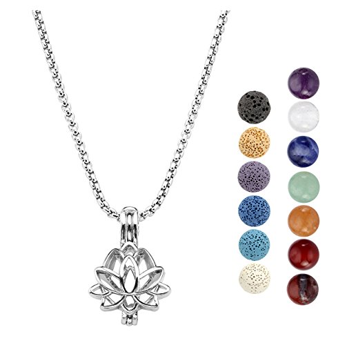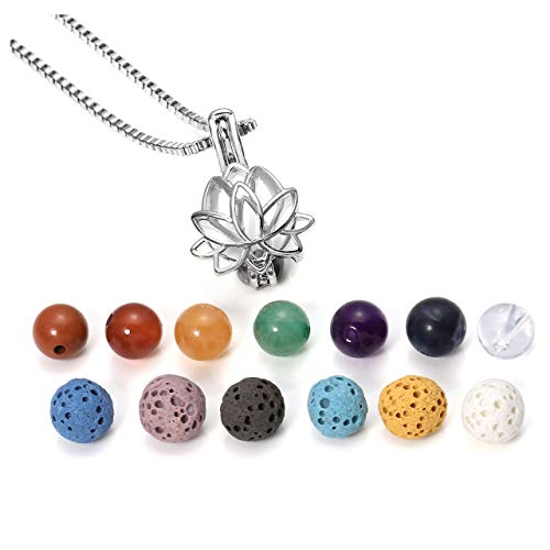 Jovivi Aromatherapy Essential Oil Diffuser Necklace Locket Pendant + 6 Dyed Lava Stone Beads + 7 Chakra Healing Crystals w/Gift Box