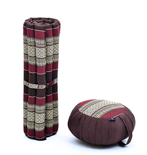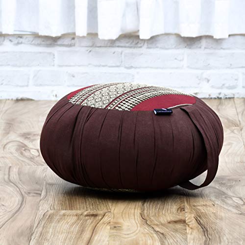 Dimension round Zafu seat pillow (Dia.xH): 40x40x20 cm; Dimension Zabuton square meditation pad (WxDxH): 69x78x4.5 cm; Material: Kapok; Colour: brown red