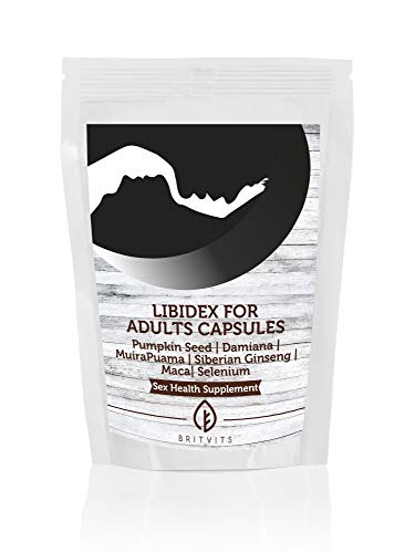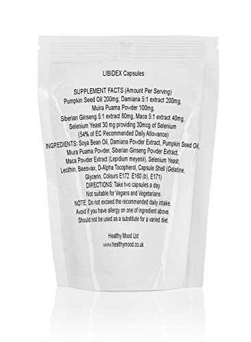 LIBIDEX 6 SUPPLEMENT FACTS (Amount Per Serving) Pumpkin Seed Oil 200mg, Damiana 5:1 extract 200mg, Muira Puama Powder 100mg, Siberian Ginseng 5:1 extract 80mg, Maca 5:1 extract 40mg, Selenium Yeast 30 mg providing 30mcg of Selenium (54% of EC Recommended Daily Allowance) INGREDIENTS: Soya Bean Oil, Damiana Powder Extract, Pumpkin Seed Oil, Miura Puama Powder, Siberian Ginseng Powder Extract, Maca Powder Extract (Lepidium meyenii), Selenium Yeast, Lecithin, Beeswax, D-Alpha Tocopherol, Capsule Shell (Gelatine, Glycerin, Colours E172 E160 (b), E171) DIRECTIONS: Take two capsules a day. NOTE: Do not exceed the recommended daily intake. Avoid if you have allergy on one of ingredient above. Should not be used as a substitute for a varied diet.