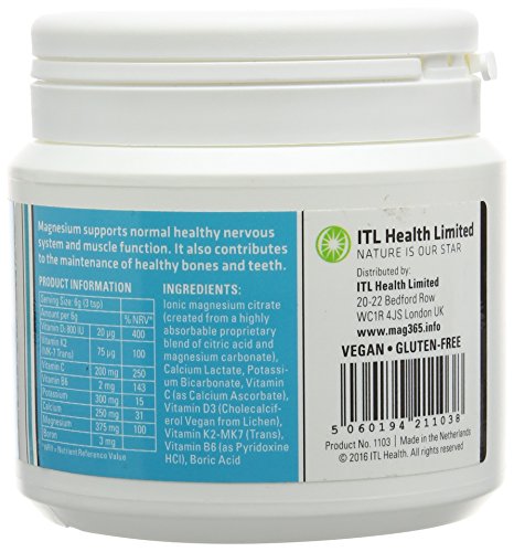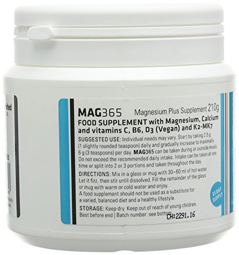 Mag365 Magnesium plus calcium food supplement is a powder with a highly soluble and bioavailable form. Superior magnesium-calcium formulation dietary food supplement. Formulated with 3 parts magnesium to 2 parts calcium, plus vitamin D3 and vitamin K2. An important nutrient essential for maintaining total body health. Keep your teeth and bones strong. Available in 210 g.