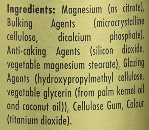 Magnesium (as citrate), Bulking Agents: (microcrystalline cellulose, hydroxypropyl cellulose, dicalcium phosphate), Anti-caking Agents: (silicon dioxide, vegetable magnesium stearate), Glazing Agents: (hydroxypropylmethyl cellulose, vegetable glycerin (from palm kernel oil and coconut oil)), Cellulose Gum, Colour: titanium dioxide.