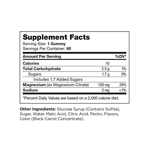 Calories 10, Total Carbohydrate 2.5g, Sugars 1.7g, Magnesium 100mg, Sodium 3mg, Glucose Syrup, Sugar, Water, Malic Acid, Citric Acid, Pectin, Flavors. Color