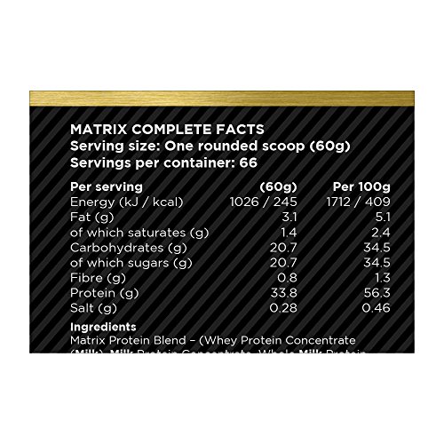 Description: Matrix Complete All in One incorporates all of the proven muscle generating ingredients science has uncovered in a balanced precision engineered blend, from the direct muscle boosting approach of HMB to the indirect approach of energy preserving MCT’s. The goal when creating Matrix Complete was not to simply see how high we could get the calorie count, it was to combine a group of ingredients with a track record for helping to develop lean muscle mass. Ingredients: Matrix Protein Blend – (Whey Protein Concentrate (Milk), Milk Protein Concentrate, Whole Milk Protein, Soya Protein Isolate). Dextrose Monohydrate. Amino Acid Matrix – (Creatine Monohydrate, Peptide Bonded Glutamine (derived from Wheat Protein), L-Glycine, Taurine, HMB). Thickeners (Acacia Gum, Xanthan Gum), Flavouring, Natural Colourings, Stabiliser (Citric Acid), Sweetener: Sucralose. Allergy Advice For allergens, including cereals containing gluten, see ingredients in bold. May also contain nuts, gluten and eggs. Directions: Mix Complete Matrix with 500ml of cold water or milk, adding powder to fluid. Training days: Take one serving before training and one after (most important) Non Training Days: Take one serving in the morning and another before bed. Per Serving: Values based on: Per Serving (60g) Per 100g Energy (kJ / kcal) 1026 / 245 1712 / 409 Protein (g) 33.8 56.3 Carbohydrates (g) 20.7 34.5 of which Sugars (g) 20.7 34.5 Fat (g) 3.1 5.1 Of which saturates 1.4 2.4 Salt (g) 0.28 0.46 Fibre (g) 0.8 1.3