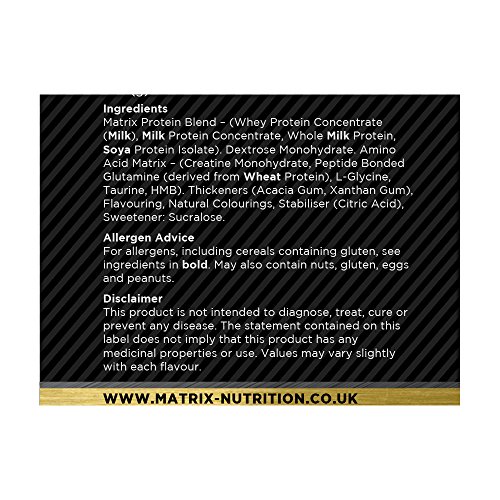 Matrix Complete Ingredients: Whey Protein Isolate, Whey Protein Concentrate, Hydrolysed Whey Protein, L-Glutamine, Creatine Monohydrate, HMB, Potassium Bicarbonate, Sodium Bicarbonate, Bioperine, Chromium Chloride, Beta-Ecdysterone, MCTs and EFAs, Natural and Identical Flavouring, Natural Colouring, Stabilisers (Citric Acid, Malis Acid) Sweetener: Sucralose. Protein analysis declared as dry matter, this is determined in the absence of water which may compromise up to 6%