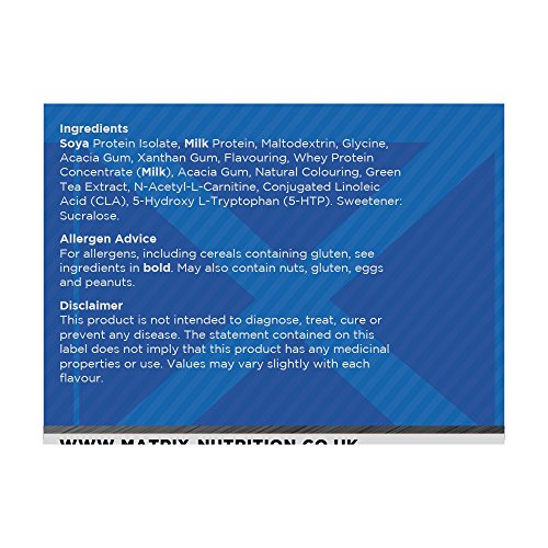 Soya Protein Isolate, Milk Protein, Maltodextrin, Glycine, Acacia Gum, Xanthan Gum, Flavouring, Whey Protein Concentrate (Milk), Acacia Gum, Natural Colouring, Green Tea Extract, N-Acetyl-L-Carnitine, Conjugated Linoleic Acid (CLA), 5-Hydroxy L-Tryptophan (5-HTP). Sweetener: Sucralose.