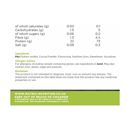 Matrix Pea Protein Isolate is a vegetarian friendly protein source, packed full of muscle protecting and building amino acids. Pea Protein Isolate is a tremendous alternative to the dairy based whey protein and is packed with a huge 73% protein and packs in 22g of protein in every nutritious serving.