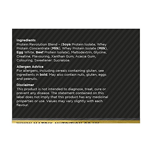 Protein Revolution Blend – (Soya Protein Isolate, Whey Protein Concentrate (Milk, Whey Protein Isolate (Milk), Egg White, Beef Protein Isolate), Maltodextrin, Glycine, Creatine, Flavouring, Xanthan Gum, Acacia Gum, Colouring, Sweetener: Sucralose.