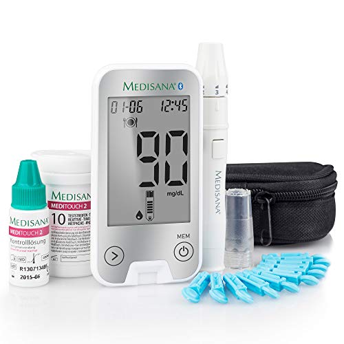 Medisana MediTouch2 Dual Silver Edition Blood Glucose Monitor with Bluetooth – Blood Sugar Testing Kit for Diabetics – mmol/L and mg/dL – Blood Sugar Tester Starter Pack – 79048