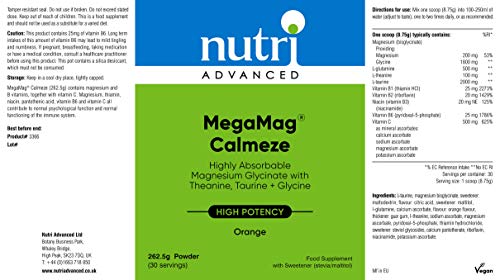 nutri Advanced megamag Calm-Eze orange flavour magnesium powder has been formulated to support normal psychological function, A healthy nervous system and to reduce tiredness and fatigue by providing a high strength combination of magnesium, vitamins B, L-Theanine, Glycine, taurine, glutamine and vitamin C. It is supplied in a tasty chamomile flavour powder which easily mixes with water or juice. It can help to support that sense of calm and harmony.